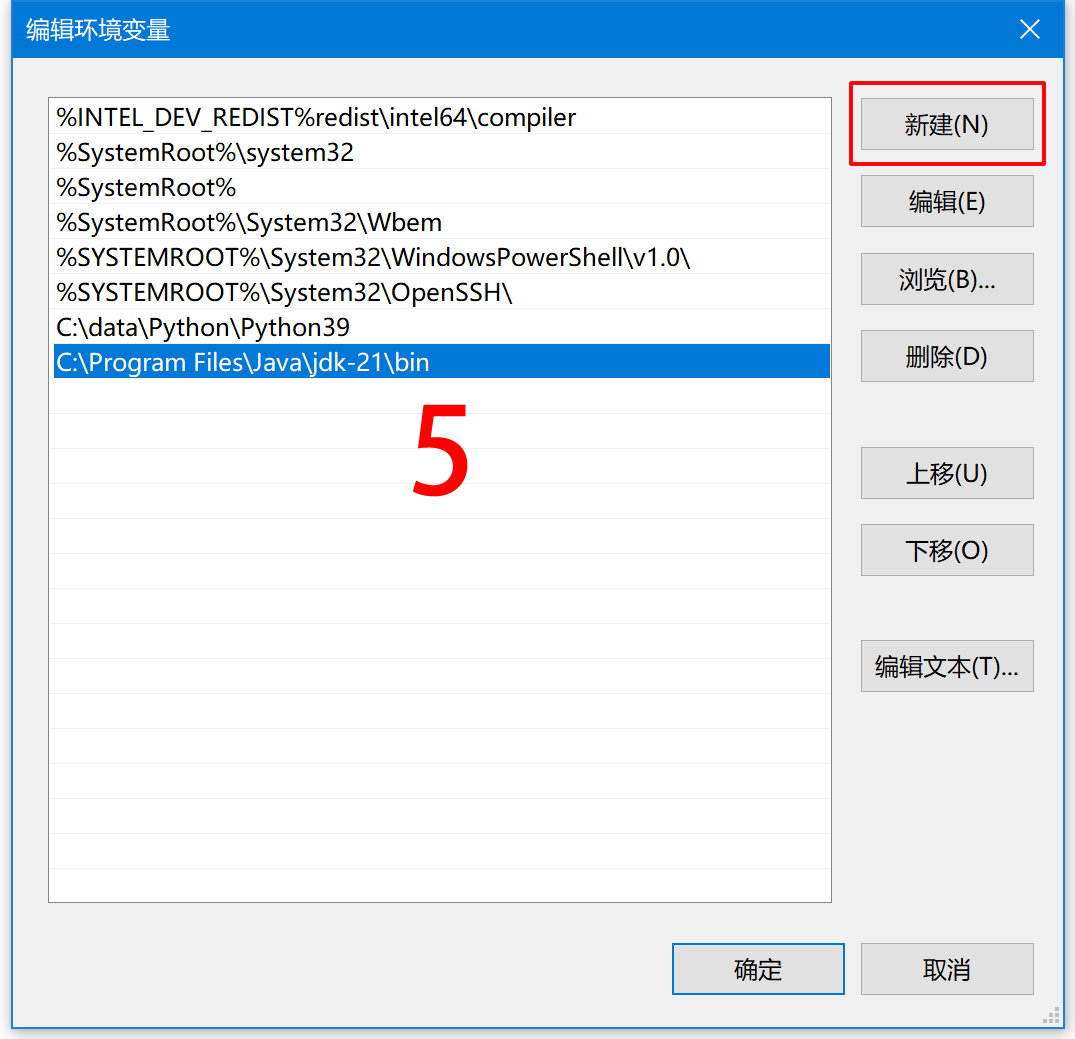 注释:以 Java21 为例,在默认情况下,Java 安装在 C:\Program Files\Java\jdk-21。在这种情况下,您需要添加的新路径是:C:\Program Files\Java\jdk-11.0.1\bin。