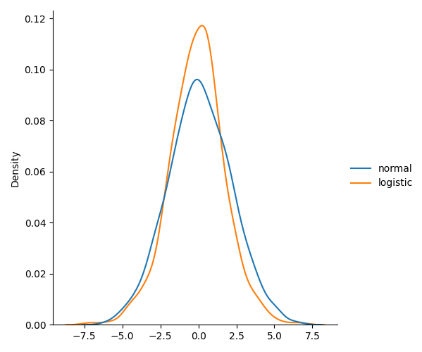 from numpy import random import matplotlib.pyplot as plt import seaborn as sns sns.displot(random.logistic(size=1000), kind="kde") plt.show()