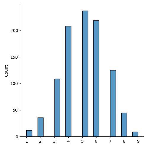 from numpy import random import matplotlib.pyplot as plt import seaborn as sns sns.displot(random.poisson(lam=2, size=1000)) plt.show()