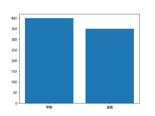 # 以下三行代码使编译器支持绘图功能: import sys import matplotlib matplotlib.use('Agg') import matplotlib.pyplot as plt import numpy as np # 准备柱状图数据: x = ["苹果", "香蕉"] # 水果类别标签 y = [400, 350] # 对应数值 # 绘制柱状图: plt.bar(x, y) # 创建基础柱状图 plt.show() # 显示图表 # 以下两行代码使编译器能够输出图形: plt.savefig(sys.stdout.buffer) sys.stdout.flush()