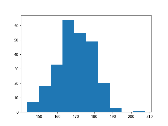 # 以下三行代码使编译器支持绘图功能: import sys import matplotlib matplotlib.use('Agg') import matplotlib.pyplot as plt import numpy as np # 生成正态分布数据: x = np.random.normal(170, 10, 250) # 均值 170,标准差 10,250 个数据点 # 绘制直方图: plt.hist(x) # 创建直方图 plt.show() # 显示图表 # 以下两行代码使编译器能够输出图形: plt.savefig(sys.stdout.buffer) sys.stdout.flush()