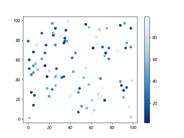 # 这三行代码使编译器能够绘图: import sys import matplotlib matplotlib.use('Agg') import matplotlib.pyplot as plt import numpy as np x = np.random.randint(100, size=(100)) y = np.random.randint(100, size=(100)) colors = np.random.randint(100, size=(100)) # 使用反向蓝色渐变绘制散点图: plt.scatter(x, y, c=colors, cmap='Blues_r') plt.colorbar() # 显示颜色条 plt.show() # 显示图形 # 这两行代码使编译器能够输出图形: plt.savefig(sys.stdout.buffer) sys.stdout.flush()