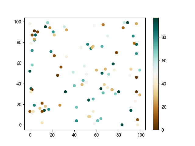 # 这三行代码使编译器能够绘图: import sys import matplotlib matplotlib.use('Agg') import matplotlib.pyplot as plt import numpy as np x = np.random.randint(100, size=(100)) y = np.random.randint(100, size=(100)) colors = np.random.randint(100, size=(100)) # 使用棕蓝绿渐变绘制散点图: plt.scatter(x, y, c=colors, cmap='BrBG') plt.colorbar() # 显示颜色条 plt.show() # 显示图形 # 这两行代码使编译器能够输出图形: plt.savefig(sys.stdout.buffer) sys.stdout.flush()