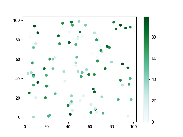 # 这三行代码使编译器能够绘图: import sys import matplotlib matplotlib.use('Agg') import matplotlib.pyplot as plt import numpy as np x = np.random.randint(100, size=(100)) y = np.random.randint(100, size=(100)) colors = np.random.randint(100, size=(100)) # 使用蓝绿色渐变绘制散点图: plt.scatter(x, y, c=colors, cmap='BuGn') plt.colorbar() # 显示颜色条 plt.show() # 显示图形 # 这两行代码使编译器能够输出图形: plt.savefig(sys.stdout.buffer) sys.stdout.flush()