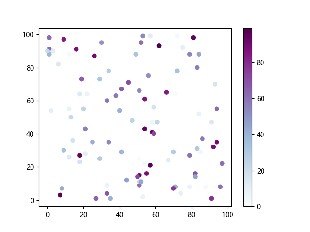 # 这三行代码使编译器能够绘图: import sys import matplotlib matplotlib.use('Agg') import matplotlib.pyplot as plt import numpy as np x = np.random.randint(100, size=(100)) y = np.random.randint(100, size=(100)) colors = np.random.randint(100, size=(100)) # 使用蓝紫色渐变绘制散点图: plt.scatter(x, y, c=colors, cmap='BuPu') plt.colorbar() # 显示颜色条 plt.show() # 显示图形 # 这两行代码使编译器能够输出图形: plt.savefig(sys.stdout.buffer) sys.stdout.flush()