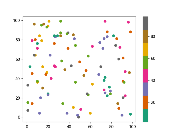 # 这三行代码使编译器能够绘图: import sys import matplotlib matplotlib.use('Agg') import matplotlib.pyplot as plt import numpy as np x = np.random.randint(100, size=(100)) y = np.random.randint(100, size=(100)) colors = np.random.randint(100, size=(100)) # 使用 Dark2 配色方案绘制散点图: plt.scatter(x, y, c=colors, cmap='Dark2') plt.colorbar() plt.show() # 这两行代码使编译器能够输出图形: plt.savefig(sys.stdout.buffer) sys.stdout.flush()