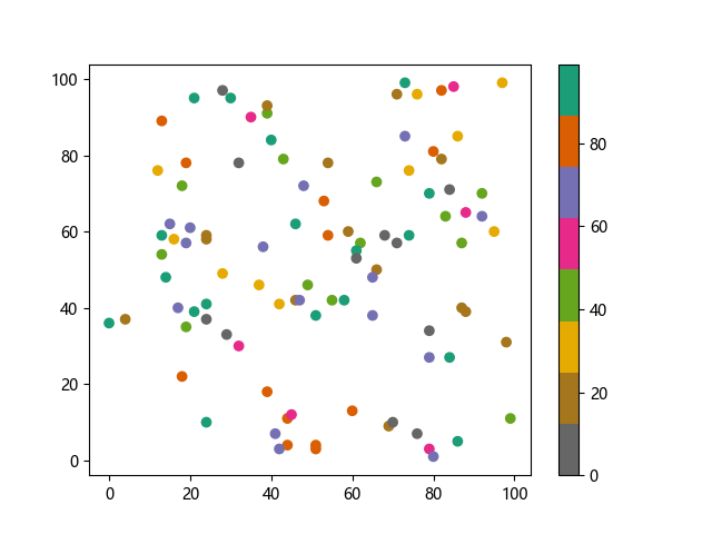 # 这三行代码使编译器能够绘图: import sys import matplotlib matplotlib.use('Agg') import matplotlib.pyplot as plt import numpy as np x = np.random.randint(100, size=(100)) y = np.random.randint(100, size=(100)) colors = np.random.randint(100, size=(100)) # 使用反向 Dark2 配色方案绘制散点图: plt.scatter(x, y, c=colors, cmap='Dark2_r') plt.colorbar() plt.show() # 这两行代码使编译器能够输出图形: plt.savefig(sys.stdout.buffer) sys.stdout.flush()