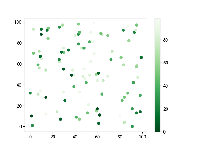 # 这三行代码使编译器能够绘图: import sys import matplotlib matplotlib.use('Agg') import matplotlib.pyplot as plt import numpy as np x = np.random.randint(100, size=(100)) y = np.random.randint(100, size=(100)) colors = np.random.randint(100, size=(100)) # 使用反向绿色渐变绘制散点图: plt.scatter(x, y, c=colors, cmap='Greens_r') plt.colorbar() plt.show() # 这两行代码使编译器能够输出图形: plt.savefig(sys.stdout.buffer) sys.stdout.flush()