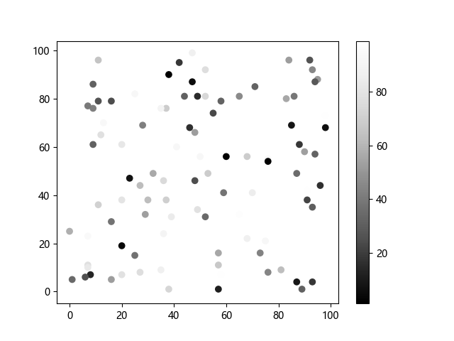 # 这三行代码使编译器能够绘图: import sys import matplotlib matplotlib.use('Agg') import matplotlib.pyplot as plt import numpy as np x = np.random.randint(100, size=(100)) y = np.random.randint(100, size=(100)) colors = np.random.randint(100, size=(100)) # 使用反向灰度渐变绘制散点图: plt.scatter(x, y, c=colors, cmap='Greys_r') plt.colorbar() plt.show() # 这两行代码使编译器能够输出图形: plt.savefig(sys.stdout.buffer) sys.stdout.flush()