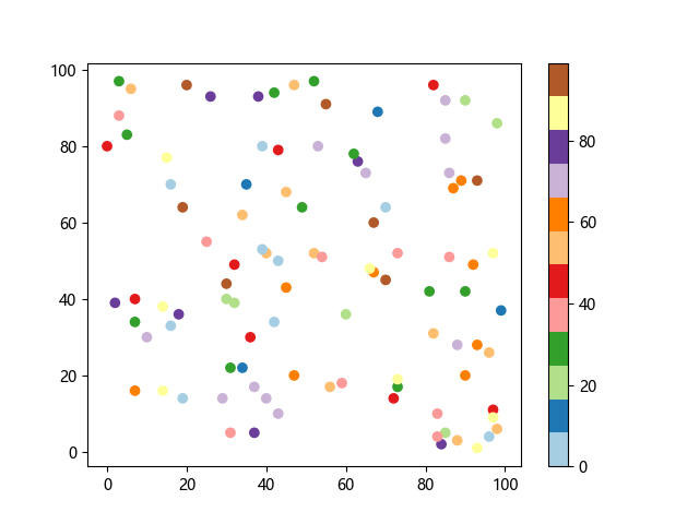 # 这三行代码使编译器能够绘图: import sys import matplotlib matplotlib.use('Agg') import matplotlib.pyplot as plt import numpy as np x = np.random.randint(100, size=(100)) y = np.random.randint(100, size=(100)) colors = np.random.randint(100, size=(100)) # 使用配对色系绘制散点图: plt.scatter(x, y, c=colors, cmap='Paired') plt.colorbar() plt.show() # 这两行代码使编译器能够输出图形: plt.savefig(sys.stdout.buffer) sys.stdout.flush()