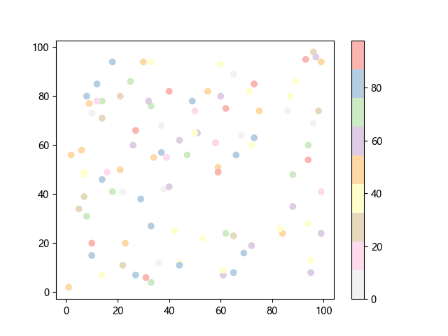 # 这三行代码使编译器能够绘图: import sys import matplotlib matplotlib.use('Agg') import matplotlib.pyplot as plt import numpy as np x = np.random.randint(100, size=(100)) y = np.random.randint(100, size=(100)) colors = np.random.randint(100, size=(100)) # 绘制反向 Pastel1 配色方案的散点图: plt.scatter(x, y, c=colors, cmap='Pastel1_r') plt.colorbar() plt.show() # 这两行代码使编译器能够输出图形: plt.savefig(sys.stdout.buffer) sys.stdout.flush()