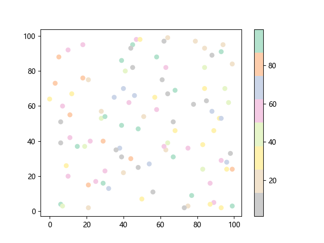 # 这三行代码使编译器能够绘图: import sys import matplotlib matplotlib.use('Agg') import matplotlib.pyplot as plt import numpy as np # 生成 100 个随机 x 坐标: x = np.random.randint(100, size=(100)) # 生成 100 个随机 y 坐标: y = np.random.randint(100, size=(100)) # 生成 100 个随机颜色值: colors = np.random.randint(100, size=(100)) # 绘制彩色散点图 plt.scatter(x, y, c=colors, cmap='Pastel2_r') plt.colorbar() # 显示颜色条 plt.show() # 显示图形 # 这两行代码使编译器能够输出图形: plt.savefig(sys.stdout.buffer) sys.stdout.flush()