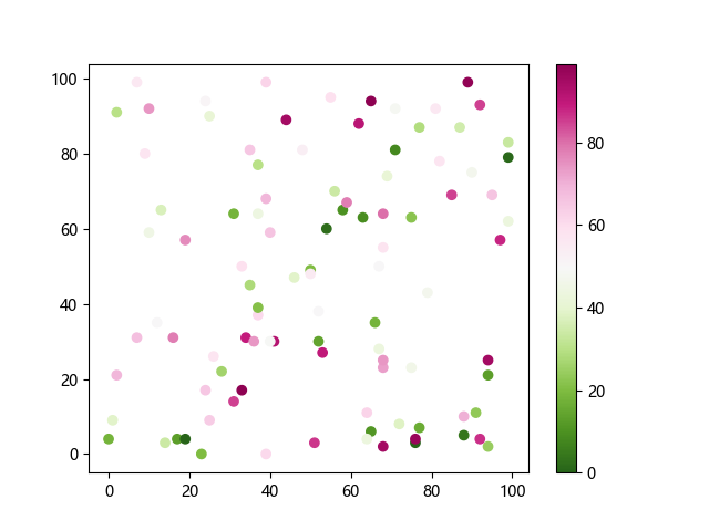 # 这三行代码使编译器能够绘图: import sys import matplotlib matplotlib.use('Agg') import matplotlib.pyplot as plt import numpy as np # 生成随机数据: x = np.random.randint(100, size=(100)) y = np.random.randint(100, size=(100)) colors = np.random.randint(100, size=(100)) # 使用 PiYG_r 配色方案绘制粉绿反向渐变色散点图: plt.scatter(x, y, c=colors, cmap='PiYG_r') plt.colorbar() # 显示颜色条 plt.show() # 显示图形 # 这两行代码使编译器能够输出图形: plt.savefig(sys.stdout.buffer) sys.stdout.flush()