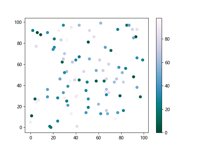 # 这三行代码使编译器能够绘图: import sys import matplotlib matplotlib.use('Agg') import matplotlib.pyplot as plt import numpy as np # 生成随机数据: x = np.random.randint(100, size=(100)) y = np.random.randint(100, size=(100)) colors = np.random.randint(100, size=(100)) # 使用 PuBuGn_r 配色方案绘制紫蓝绿反向渐变色散点图: plt.scatter(x, y, c=colors, cmap='PuBuGn_r') plt.colorbar() # 显示颜色条 plt.show() # 显示图形 # 这两行代码使编译器能够输出图形: plt.savefig(sys.stdout.buffer) sys.stdout.flush()