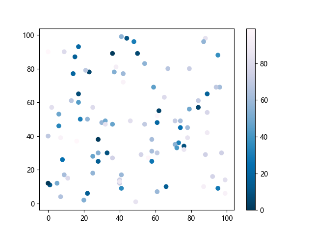 # 这三行代码使编译器能够绘图: import sys import matplotlib matplotlib.use('Agg') import matplotlib.pyplot as plt import numpy as np # 生成随机数据: x = np.random.randint(100, size=(100)) y = np.random.randint(100, size=(100)) colors = np.random.randint(100, size=(100)) # 使用 PuBu_r 配色方案绘制紫蓝色反向渐变色散点图: plt.scatter(x, y, c=colors, cmap='PuBu_r') plt.colorbar() # 显示颜色条 plt.show() # 显示图形 # 这两行代码使编译器能够输出图形: plt.savefig(sys.stdout.buffer) sys.stdout.flush()