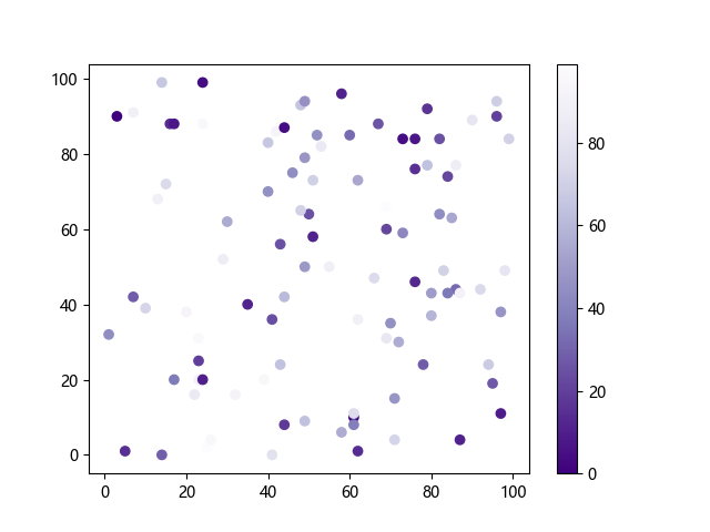 # 这三行代码使编译器能够绘图: import sys import matplotlib matplotlib.use('Agg') import matplotlib.pyplot as plt import numpy as np # 生成随机数据: x = np.random.randint(100, size=(100)) y = np.random.randint(100, size=(100)) colors = np.random.randint(100, size=(100)) # 使用 Purples_r 配色方案绘制紫色反向渐变色散点图: plt.scatter(x, y, c=colors, cmap='Purples_r') plt.colorbar() # 显示颜色条 plt.show() # 显示图形 # 这两行代码使编译器能够输出图形: plt.savefig(sys.stdout.buffer) sys.stdout.flush()