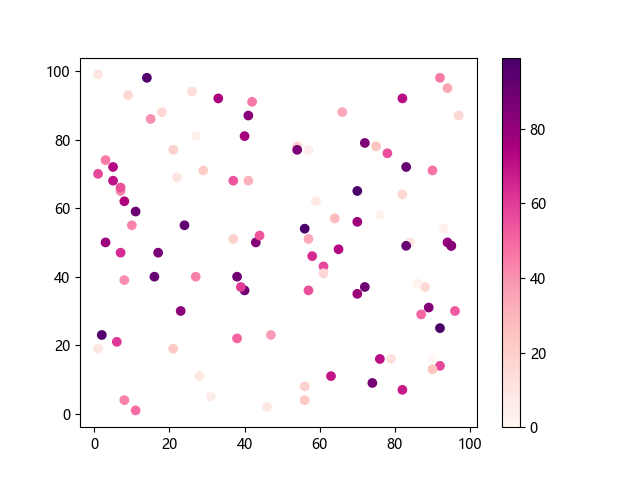# 这三行代码使编译器能够绘图: import sys import matplotlib matplotlib.use('Agg') import matplotlib.pyplot as plt import numpy as np # 生成随机数据 x = np.random.randint(100, size=(100)) y = np.random.randint(100, size=(100)) colors = np.random.randint(100, size=(100)) # 使用 RdPu 配色方案绘制红紫色渐变色散点图: plt.scatter(x, y, c=colors, cmap='RdPu') plt.colorbar() # 显示颜色条 plt.show() # 显示图形 # 这两行代码使编译器能够输出图形: plt.savefig(sys.stdout.buffer) sys.stdout.flush()