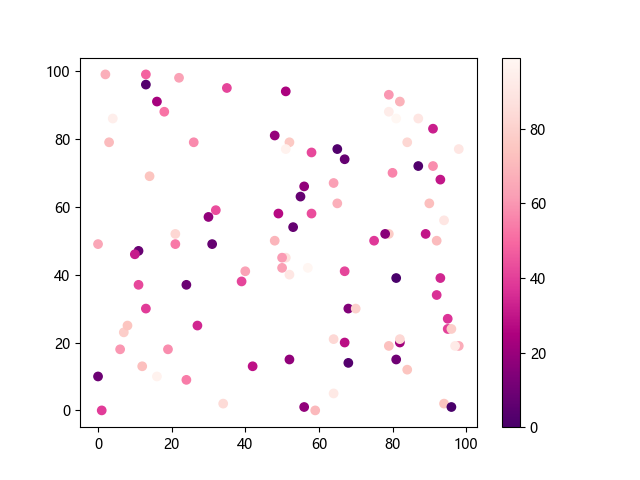 # 这三行代码使编译器能够绘图: import sys import matplotlib matplotlib.use('Agg') import matplotlib.pyplot as plt import numpy as np # 生成随机数据: x = np.random.randint(100, size=(100)) y = np.random.randint(100, size=(100)) colors = np.random.randint(100, size=(100)) # 使用 RdPu_r 配色方案绘制红紫色反向渐变色散点图: plt.scatter(x, y, c=colors, cmap='RdPu_r') plt.colorbar() # 显示颜色条 plt.show() # 显示图形 # 这两行代码使编译器能够输出图形: plt.savefig(sys.stdout.buffer) sys.stdout.flush()