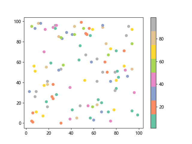 # 这三行代码使编译器能够绘图: import sys import matplotlib matplotlib.use('Agg') import matplotlib.pyplot as plt import numpy as np # 生成随机数据: x = np.random.randint(100, size=(100)) y = np.random.randint(100, size=(100)) colors = np.random.randint(100, size=(100)) # 使用 Set2 (8 色调色板)配色方案绘制 Set2 离散色散点图: plt.scatter(x, y, c=colors, cmap='Set2') plt.colorbar() # 显示颜色条 plt.show() # 显示图形 # 这两行代码使编译器能够输出图形: plt.savefig(sys.stdout.buffer) sys.stdout.flush()