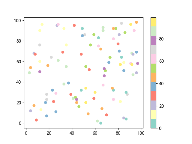 # 这三行代码使编译器能够绘图: import sys import matplotlib matplotlib.use('Agg') import matplotlib.pyplot as plt import numpy as np # 生成随机数据: x = np.random.randint(100, size=(100)) y = np.random.randint(100, size=(100)) colors = np.random.randint(100, size=(100)) # 使用 Set3 (12 色调色板)配色方案绘制 Set3 离散色散点图: plt.scatter(x, y, c=colors, cmap='Set3') plt.colorbar() # 显示颜色条 plt.show() # 显示图形 # 这两行代码使编译器能够输出图形: plt.savefig(sys.stdout.buffer) sys.stdout.flush()