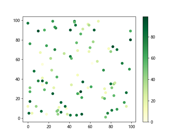 # 这三行代码使编译器能够绘图: import sys import matplotlib matplotlib.use('Agg') import matplotlib.pyplot as plt import numpy as np # 生成随机数据: x = np.random.randint(100, size=(100)) y = np.random.randint(100, size=(100)) colors = np.random.randint(100, size=(100)) # 使用 YlGn (黄-绿渐变)配色方案绘制散点图: plt.scatter(x, y, c=colors, cmap='YlGn') plt.colorbar() # 显示颜色条 plt.show() # 显示图形 # 这两行代码使编译器能够输出图形: plt.savefig(sys.stdout.buffer) sys.stdout.flush()