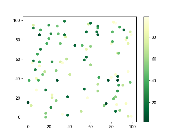 # 这三行代码使编译器能够绘图: import sys import matplotlib matplotlib.use('Agg') import matplotlib.pyplot as plt import numpy as np # 生成随机数据: x = np.random.randint(100, size=(100)) y = np.random.randint(100, size=(100)) colors = np.random.randint(100, size=(100)) # 使用YlGn_r(黄-绿反向渐变)配色方案绘制散点图: plt.scatter(x, y, c=colors, cmap='YlGn_r') plt.colorbar() # 显示颜色条 plt.show() # 显示图形 # 这两行代码使编译器能够输出图形: plt.savefig(sys.stdout.buffer) sys.stdout.flush()