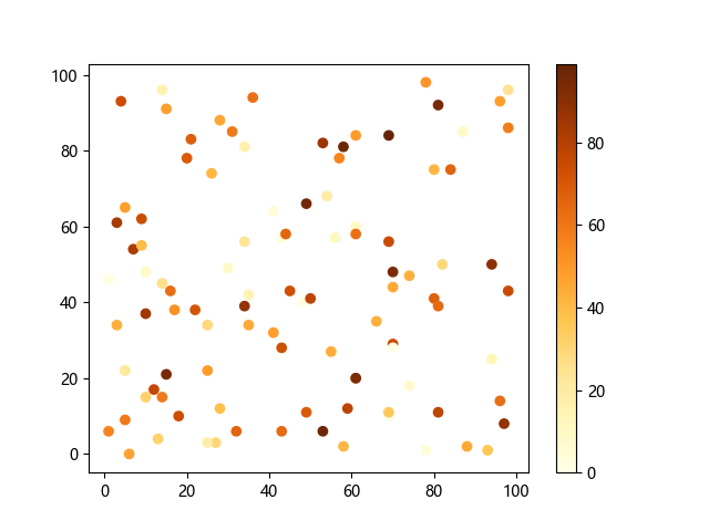 # 这三行代码使编译器能够绘图: import sys import matplotlib matplotlib.use('Agg') import matplotlib.pyplot as plt import numpy as np # 生成随机数据: x = np.random.randint(100, size=(100)) y = np.random.randint(100, size=(100)) colors = np.random.randint(100, size=(100)) # 使用 YlOrBr (黄-橙-棕渐变)配色方案绘制黄橙棕渐变散点图: plt.scatter(x, y, c=colors, cmap='YlOrBr') plt.colorbar() # 显示颜色条 plt.show() # 显示图形 # 这两行代码使编译器能够输出图形: plt.savefig(sys.stdout.buffer) sys.stdout.flush()