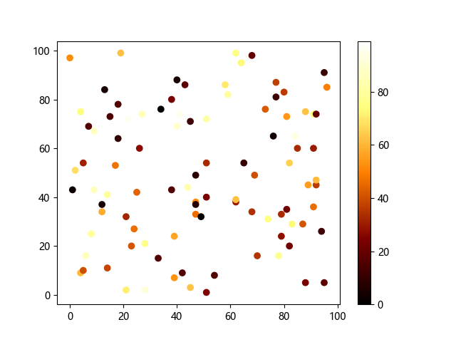 # 这三行代码使编译器能够绘图: import sys import matplotlib matplotlib.use('Agg') import matplotlib.pyplot as plt import numpy as np # 生成随机数据: x = np.random.randint(100, size=(100)) y = np.random.randint(100, size=(100)) colors = np.random.randint(100, size=(100)) # 使用 afmhot (热金属)配色方案绘制热金属色散点图: plt.scatter(x, y, c=colors, cmap='afmhot') plt.colorbar() # 显示颜色条 plt.show() # 显示图形 # 这两行代码使编译器能够输出图形: plt.savefig(sys.stdout.buffer) sys.stdout.flush()