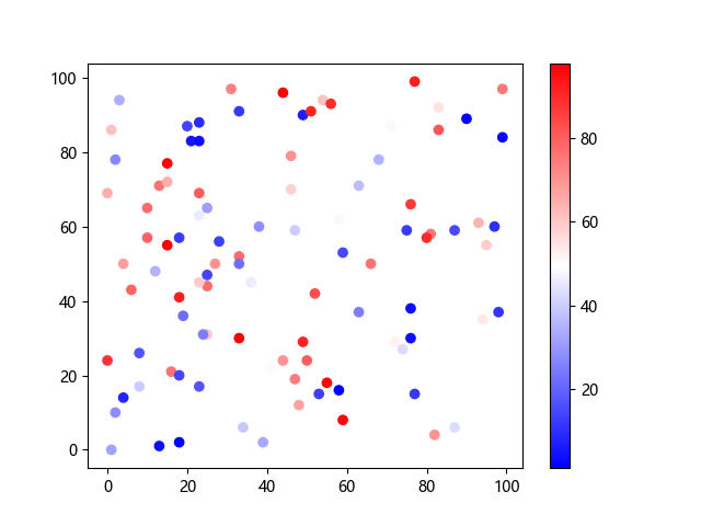 # 这三行代码使编译器能够绘图: import sys import matplotlib matplotlib.use('Agg') import matplotlib.pyplot as plt import numpy as np # 生成随机数据 x = np.random.randint(100, size=(100)) y = np.random.randint(100, size=(100)) colors = np.random.randint(100, size=(100)) # 使用 bwr 配色方案绘制蓝白红渐变色散点图: plt.scatter(x, y, c=colors, cmap='bwr') plt.colorbar() plt.show() # 这两行代码使编译器能够输出图形: plt.savefig(sys.stdout.buffer) sys.stdout.flush()