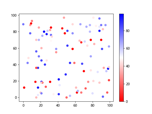 # 这三行代码使编译器能够绘图: import sys import matplotlib matplotlib.use('Agg') import matplotlib.pyplot as plt import numpy as np # 生成随机数据点 x = np.random.randint(100, size=(100)) y = np.random.randint(100, size=(100)) colors = np.random.randint(100, size=(100)) # 使用 bwr_r 配色方案绘制蓝白红反向渐变色散点图: plt.scatter(x, y, c=colors, cmap='bwr_r') plt.colorbar() plt.show() # 这两行代码使编译器能够输出图形: plt.savefig(sys.stdout.buffer) sys.stdout.flush()