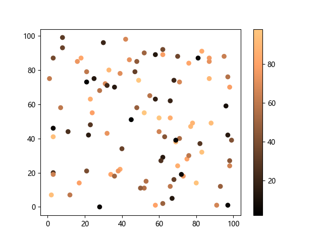 # 这三行代码使编译器能够绘图: import sys import matplotlib matplotlib.use('Agg') import matplotlib.pyplot as plt import numpy as np # 生成随机数据 x = np.random.randint(100, size=(100)) y = np.random.randint(100, size=(100)) colors = np.random.randint(100, size=(100)) # 使用 copper 配色方案绘制铜色渐变色散点图: plt.scatter(x, y, c=colors, cmap='copper') plt.colorbar() plt.show() # 这两行代码使编译器能够输出图形: plt.savefig(sys.stdout.buffer) sys.stdout.flush()
