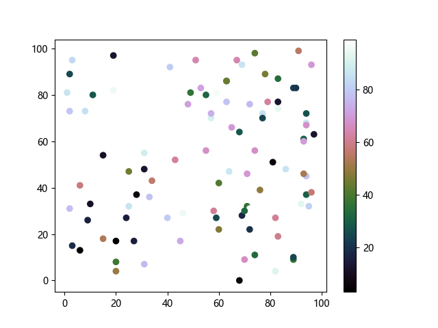 # 这三行代码使编译器能够绘图: import sys import matplotlib matplotlib.use('Agg') import matplotlib.pyplot as plt import numpy as np # 生成随机数据 x = np.random.randint(100, size=(100)) y = np.random.randint(100, size=(100)) colors = np.random.randint(100, size=(100)) # 使用 cubehelix 配色方案绘制螺旋立方体渐变色散点图: plt.scatter(x, y, c=colors, cmap='cubehelix') plt.colorbar() plt.show() # 这两行代码使编译器能够输出图形: plt.savefig(sys.stdout.buffer) sys.stdout.flush()