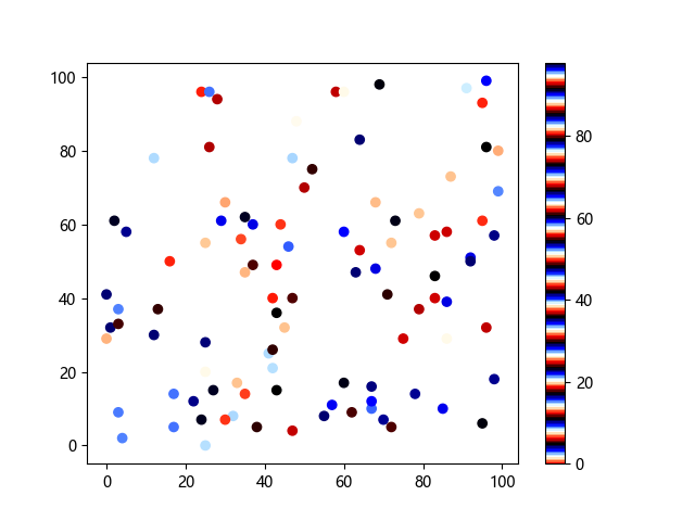 # 这三行代码使编译器能够绘图: import sys import matplotlib matplotlib.use('Agg') import matplotlib.pyplot as plt import numpy as np # 生成随机数据 x = np.random.randint(100, size=(100)) y = np.random.randint(100, size=(100)) colors = np.random.randint(100, size=(100)) # 使用 flag 配色方案绘制旗帜渐变色散点图: plt.scatter(x, y, c=colors, cmap='flag') plt.colorbar() plt.show() # 这两行代码使编译器能够输出图形: plt.savefig(sys.stdout.buffer) sys.stdout.flush()