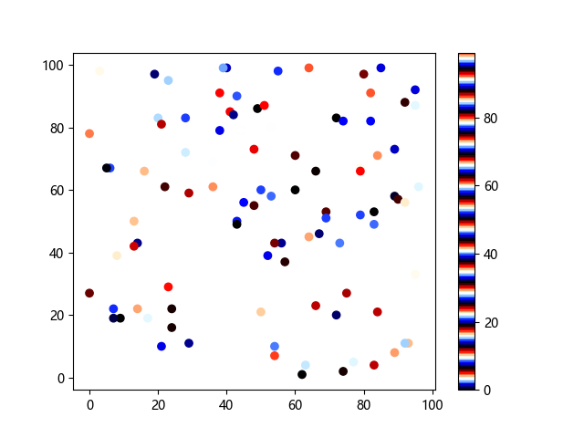 # 这三行代码使编译器能够绘图: import sys import matplotlib matplotlib.use('Agg') import matplotlib.pyplot as plt import numpy as np # 生成随机数据点 x = np.random.randint(100, size=(100)) y = np.random.randint(100, size=(100)) colors = np.random.randint(100, size=(100)) # 使用 flag_r 配色方案绘制旗帜反向渐变色散点图: plt.scatter(x, y, c=colors, cmap='flag_r') plt.colorbar() plt.show() # 这两行代码使编译器能够输出图形: plt.savefig(sys.stdout.buffer) sys.stdout.flush()