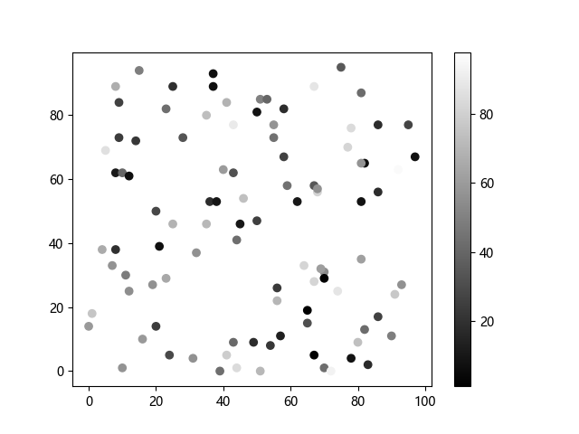 # 这三行代码使编译器能够绘图: import sys import matplotlib matplotlib.use('Agg') import matplotlib.pyplot as plt import numpy as np # 生成随机数据 x = np.random.randint(100, size=(100)) y = np.random.randint(100, size=(100)) colors = np.random.randint(100, size=(100)) # 使用 gist_gray 配色方案绘制灰度渐变色散点图: plt.scatter(x, y, c=colors, cmap='gist_gray') plt.colorbar() plt.show() # 这两行代码使编译器能够输出图形: plt.savefig(sys.stdout.buffer) sys.stdout.flush()
