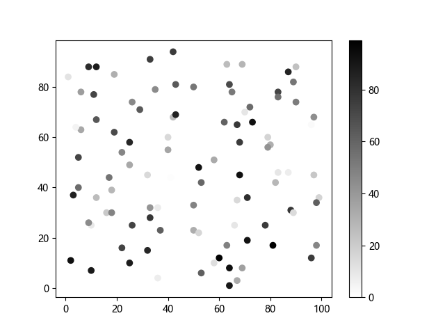 # 这三行代码使编译器能够绘图: import sys import matplotlib matplotlib.use('Agg') import matplotlib.pyplot as plt import numpy as np # 生成随机数据点 x = np.random.randint(100, size=(100)) y = np.random.randint(100, size=(100)) colors = np.random.randint(100, size=(100)) # 使用 gist_gray_r 配色方案绘制灰度反向渐变色散点图: plt.scatter(x, y, c=colors, cmap='gist_gray_r') plt.colorbar() plt.show() # 这两行代码使编译器能够输出图形: plt.savefig(sys.stdout.buffer) sys.stdout.flush()
