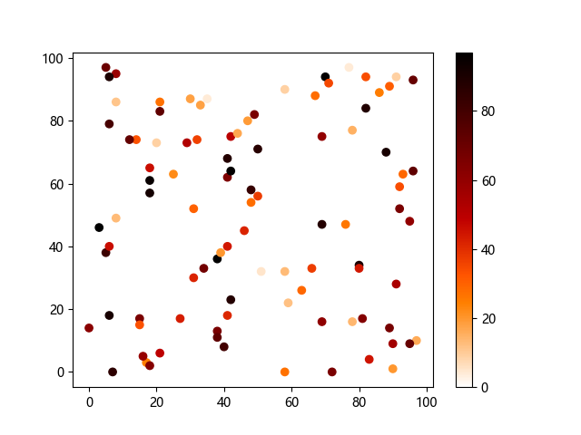 # 这三行代码使编译器能够绘图: import sys import matplotlib matplotlib.use('Agg') import matplotlib.pyplot as plt import numpy as np # 生成随机数据点 x = np.random.randint(100, size=(100)) y = np.random.randint(100, size=(100)) colors = np.random.randint(100, size=(100)) # 使用 gist_heat_r 配色方案绘制热力图反向渐变色散点图: plt.scatter(x, y, c=colors, cmap='gist_heat_r') plt.colorbar() plt.show() # 这两行代码使编译器能够输出图形: plt.savefig(sys.stdout.buffer) sys.stdout.flush()