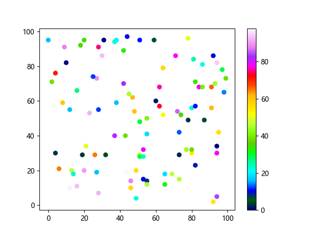 # 这三行代码使编译器能够绘图: import sys import matplotlib matplotlib.use('Agg') import matplotlib.pyplot as plt import numpy as np # 生成随机数据 x = np.random.randint(100, size=(100)) y = np.random.randint(100, size=(100)) colors = np.random.randint(100, size=(100)) # 使用 gist_ncar 配色方案绘制NCAR渐变色散点图: plt.scatter(x, y, c=colors, cmap='gist_ncar') plt.colorbar() plt.show() # 这两行代码使编译器能够输出图形: plt.savefig(sys.stdout.buffer) sys.stdout.flush()