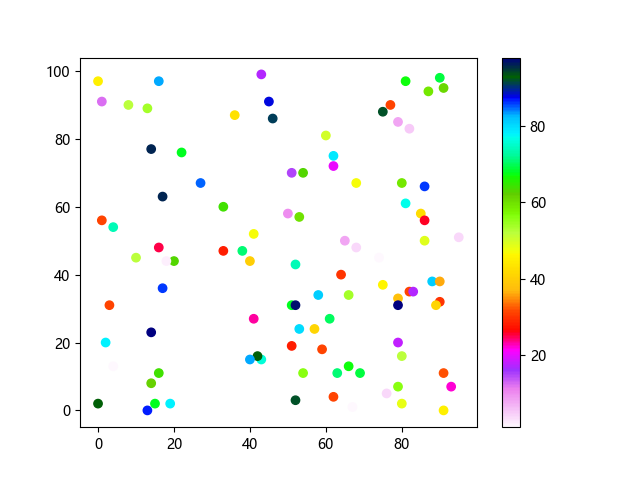 # 这三行代码使编译器能够绘图: import sys import matplotlib matplotlib.use('Agg') import matplotlib.pyplot as plt import numpy as np # 生成随机数据点 x = np.random.randint(100, size=(100)) y = np.random.randint(100, size=(100)) colors = np.random.randint(100, size=(100)) # 使用 gist_ncar_r 配色方案绘制 NCAR 反向渐变色散点图: plt.scatter(x, y, c=colors, cmap='gist_ncar_r') plt.colorbar() plt.show() # 这两行代码使编译器能够输出图形: plt.savefig(sys.stdout.buffer) sys.stdout.flush()
