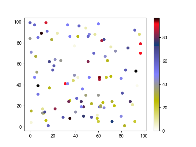 # 这三行代码使编译器能够绘图: import sys import matplotlib matplotlib.use('Agg') import matplotlib.pyplot as plt import numpy as np # 生成随机数据点 x = np.random.randint(100, size=(100)) y = np.random.randint(100, size=(100)) colors = np.random.randint(100, size=(100)) # 使用 gist_stern_r 配色方案绘制星云反向渐变色散点图: plt.scatter(x, y, c=colors, cmap='gist_stern_r') plt.colorbar() plt.show() # 这两行代码使编译器能够输出图形: plt.savefig(sys.stdout.buffer) sys.stdout.flush()