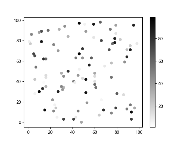 # 这三行代码使编译器能够绘图: import sys import matplotlib matplotlib.use('Agg') import matplotlib.pyplot as plt import numpy as np # 生成随机数据 x = np.random.randint(100, size=(100)) y = np.random.randint(100, size=(100)) colors = np.random.randint(100, size=(100)) # 使用 gist_yarg 配色方案绘制灰度渐变色散点图: plt.scatter(x, y, c=colors, cmap='gist_yarg') plt.colorbar() plt.show() # 这两行代码使编译器能够输出图形: plt.savefig(sys.stdout.buffer) sys.stdout.flush()