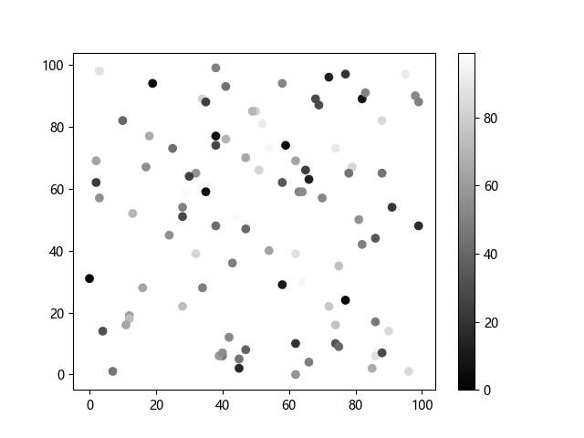 # 这三行代码使编译器能够绘图: import sys import matplotlib matplotlib.use('Agg') import matplotlib.pyplot as plt import numpy as np # 生成随机数据点 x = np.random.randint(100, size=(100)) y = np.random.randint(100, size=(100)) colors = np.random.randint(100, size=(100)) # 使用 gist_yarg_r 配色方案绘制灰度反向渐变色散点图: plt.scatter(x, y, c=colors, cmap='gist_yarg_r') plt.colorbar() plt.show() # 这两行代码使编译器能够输出图形: plt.savefig(sys.stdout.buffer) sys.stdout.flush()