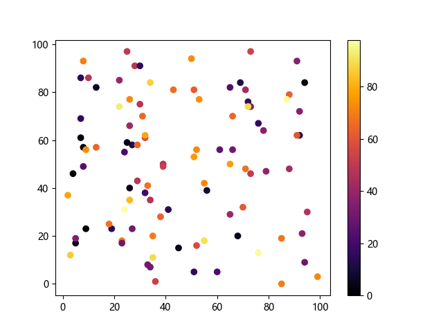 # 这三行代码使编译器能够绘图: import sys import matplotlib matplotlib.use('Agg') import matplotlib.pyplot as plt import numpy as np # 生成随机数据 x = np.random.randint(100, size=(100)) y = np.random.randint(100, size=(100)) colors = np.random.randint(100, size=(100)) # 使用 inferno 配色方案绘制地狱火渐变色散点图: plt.scatter(x, y, c=colors, cmap='inferno') plt.colorbar() plt.show() # 这两行代码使编译器能够输出图形: plt.savefig(sys.stdout.buffer) sys.stdout.flush()