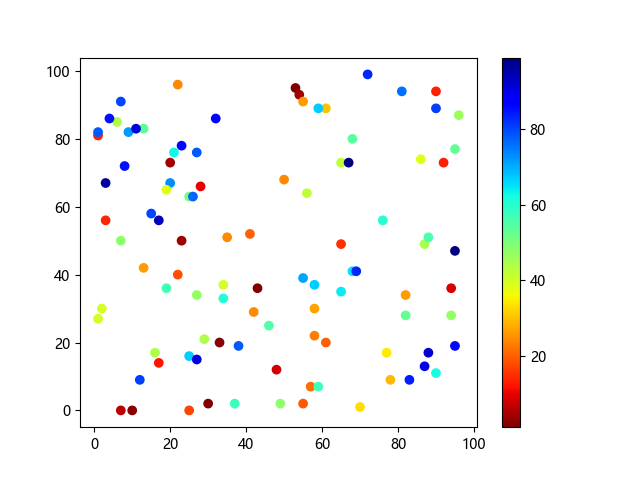 # 这三行代码使编译器能够绘图: import sys import matplotlib matplotlib.use('Agg') import matplotlib.pyplot as plt import numpy as np # 生成随机数据点 x = np.random.randint(100, size=(100)) y = np.random.randint(100, size=(100)) colors = np.random.randint(100, size=(100)) # 使用 jet_r 配色方案绘制 Jet 反向渐变色散点图: plt.scatter(x, y, c=colors, cmap='jet_r') plt.colorbar() plt.show() # 这两行代码使编译器能够输出图形: plt.savefig(sys.stdout.buffer) sys.stdout.flush()