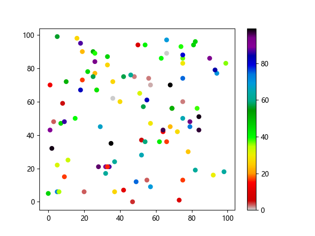 #Three lines to make our compiler able to draw: import sys import matplotlib matplotlib.use('Agg') import matplotlib.pyplot as plt import numpy as np x = np.random.randint(100, size=(100)) y = np.random.randint(100, size=(100)) colors = np.random.randint(100, size=(100)) plt.scatter(x, y, c=colors, cmap='nipy_spectral_r') plt.colorbar() plt.show() #Two lines to make our compiler able to draw: plt.savefig(sys.stdout.buffer) sys.stdout.flush()