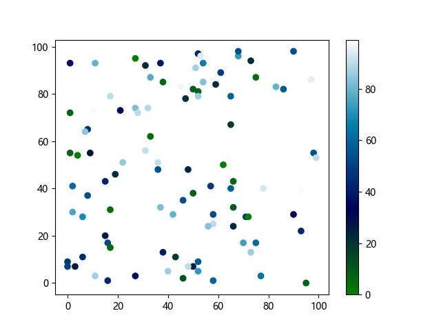 # 这三行代码使编译器能够绘图: import sys import matplotlib matplotlib.use('Agg') import matplotlib.pyplot as plt import numpy as np # 生成随机数据 x = np.random.randint(100, size=(100)) y = np.random.randint(100, size=(100)) colors = np.random.randint(100, size=(100)) # 使用 ocean 配色方案绘制海洋渐变色散点图: plt.scatter(x, y, c=colors, cmap='ocean') plt.colorbar() plt.show() # 这两行代码使编译器能够输出图形: plt.savefig(sys.stdout.buffer) sys.stdout.flush()