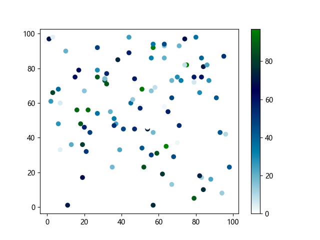 # 这三行代码使编译器能够绘图: import sys import matplotlib matplotlib.use('Agg') import matplotlib.pyplot as plt import numpy as np # 生成随机数据点 x = np.random.randint(100, size=(100)) y = np.random.randint(100, size=(100)) colors = np.random.randint(100, size=(100)) # 使用 ocean_r 配色方案绘制海洋色反向渐变色散点图: plt.scatter(x, y, c=colors, cmap='ocean_r') plt.colorbar() plt.show() # 这两行代码使编译器能够输出图形: plt.savefig(sys.stdout.buffer) sys.stdout.flush()