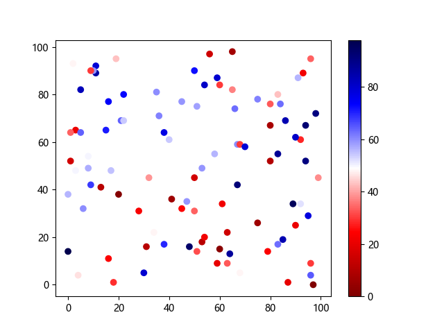 # 以下三行代码使编译器支持绘图功能: import sys import matplotlib matplotlib.use('Agg') import matplotlib.pyplot as plt import numpy as np # 生成随机数据: x = np.random.randint(100, size=(100)) y = np.random.randint(100, size=(100)) colors = np.random.randint(100, size=(100)) # 使用 seismic 反向配色方案创建散点图: plt.scatter(x, y, c=colors, cmap='seismic_r') plt.colorbar() plt.show() # 以下两行代码使编译器能够输出图形: plt.savefig(sys.stdout.buffer) sys.stdout.flush()