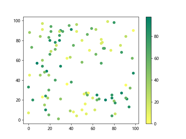 # 以下三行代码使编译器支持绘图功能: import sys import matplotlib matplotlib.use('Agg') import matplotlib.pyplot as plt import numpy as np # 生成随机数据: x = np.random.randint(100, size=(100)) y = np.random.randint(100, size=(100)) colors = np.random.randint(100, size=(100)) # 使用 summer 反向配色方案创建散点图: plt.scatter(x, y, c=colors, cmap='summer_r') plt.colorbar() plt.show() # 以下两行代码使编译器能够输出图形: plt.savefig(sys.stdout.buffer) sys.stdout.flush()