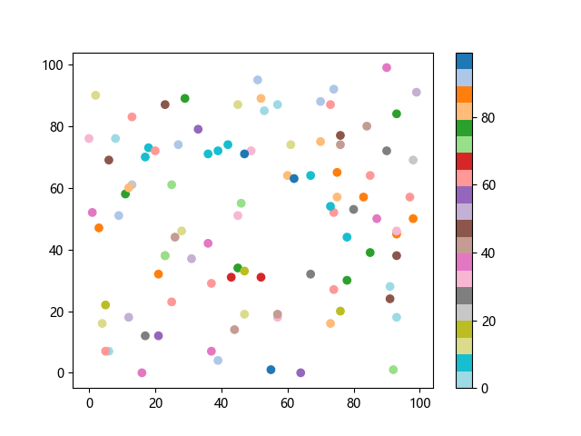 # 以下三行代码使编译器支持绘图功能: import sys import matplotlib matplotlib.use('Agg') import matplotlib.pyplot as plt import numpy as np # 生成随机数据: x = np.random.randint(100, size=(100)) y = np.random.randint(100, size=(100)) colors = np.random.randint(100, size=(100)) # 使用 tab20 反向离散配色方案创建散点图: plt.scatter(x, y, c=colors, cmap='tab20_r') plt.colorbar() plt.show() # 以下两行代码使编译器能够输出图形: plt.savefig(sys.stdout.buffer) sys.stdout.flush()
